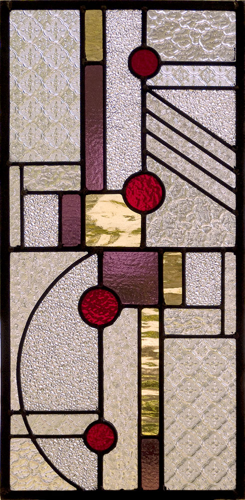 I've got my leadlight window installed now. It's just held in place in front of the existing glass with some rimu beading, which simplifies matters enormously — I don't have to worry about it being weathertight (I suspect it's not), if I want to, I can dismount it pretty easily, and it's quite well protected from damage from outside.