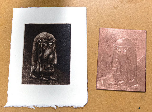 This is a little mezzotint on copper, about 90 x 65 mm. I like mezzotint a lot for its deep, velvety blacks and smooth tonal transitions. It was, at one time, used for very detailed images — I'm nowhere near there.